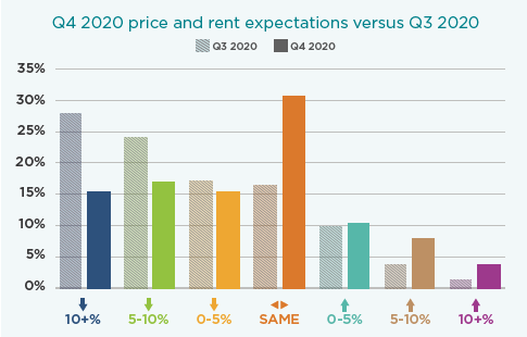| Comparing Q4 with Q3 2020, the percentage of respondents expecting prices and rents to go down by 10% or more has fallen by 12 percentage points, from 28% to 15%. Counterbalancing that, the percentage of respondents that now believe prices and rents will remain the same in the next 12 months has increased by 14 points, from 16% to 31%. ‘Remain the same’ is, by some margin, the most common response, making up 31% of total responses. | ![]() |
